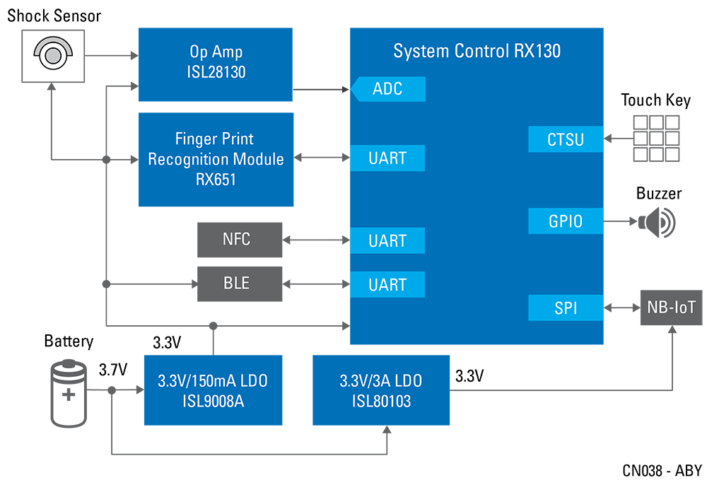 在智能家居应用领域,智能锁呈迅速发展态势。用户可以通过使用指纹、近场通信 (NFC)、电容触屏或低功率 Bluetooth® 通信来控制智能锁。采用低功率设计,窄带物联网 (NB-IoT) 也是一种选择。RX130 微控制器已集成电容触屏功能,可采用较小面板设计,降低成本。对于具有更加复杂的指纹模块的高级系统,针对算法设计,可选择升级至 RX651。
